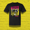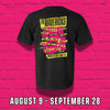 This black short sleeve tee features a graphic of The Mavericks on the front with text that reads, "Moon & Stars Tour '24". The back features a matching yellow and pink graphic with all of the stops of the tour.