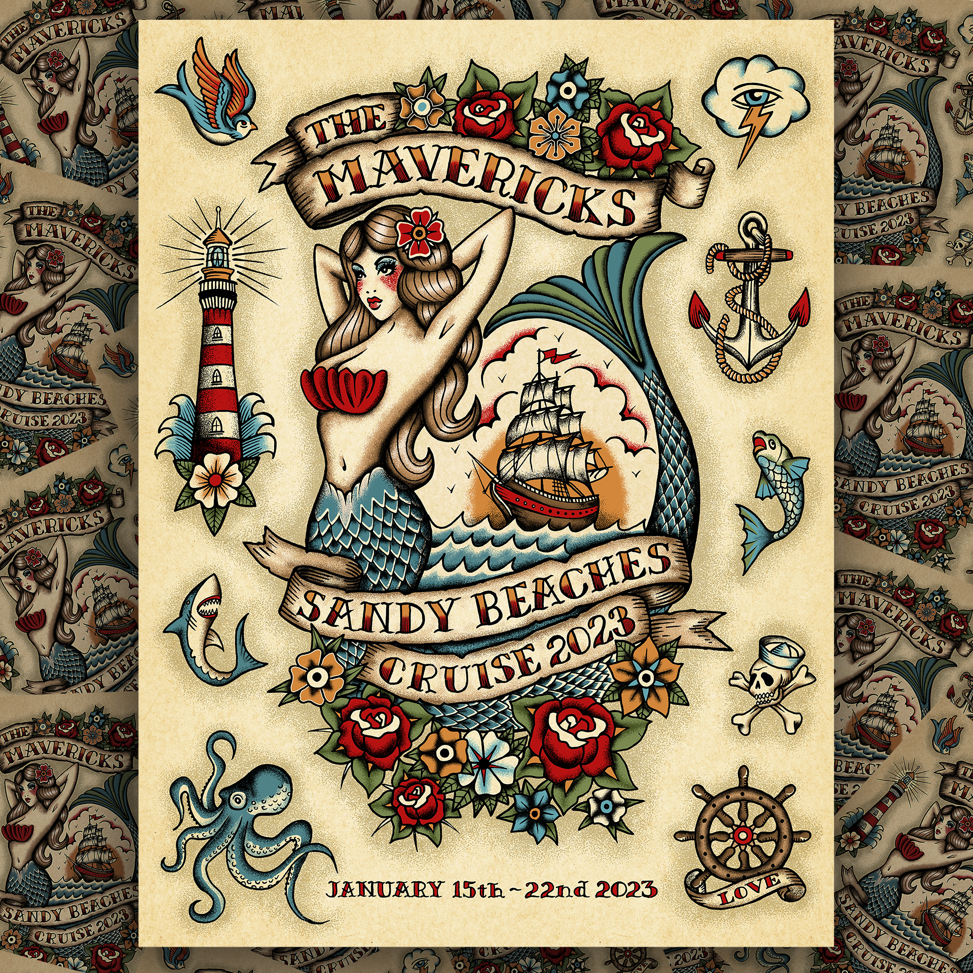 From our good friend designer Nick Farrow comes this 18" x 24" print celebrating the Sandy Beaches Cruise 2023! Printed on 300 gsm, 100% cotton rag, archival, acid free paper.