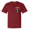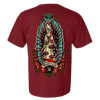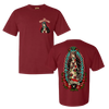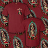 This maroon-colored t-shirt features the "Our Lady Guadalupe" design on the front and back.
