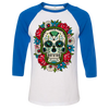 White raglan shirt with stylish Royal Blue 3/4 sleeves, featuring our colorful Flower Skull artwork by Nick Farrow